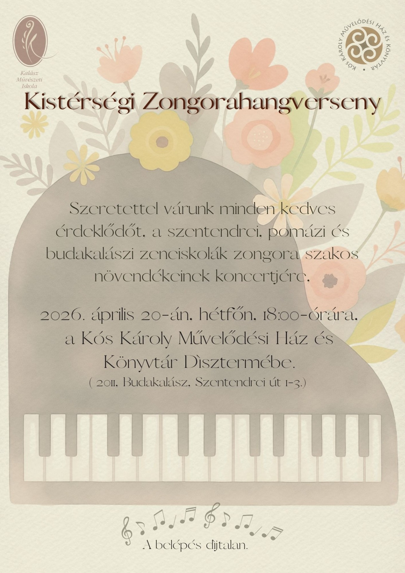 Szeretettel meghívjuk Önt és kedves családját a Kistérségi Zongoratanárok Fóruma által rendezett zongorahangversenyre 2026. április 20-án (hétfőn) 18 órára a budakalászi Kós Károly Művelődési Ház Dísztermébe. A hangversenyen fellépnek a szentendrei, pomázi és budakalászi zongora tanszak növendékei.